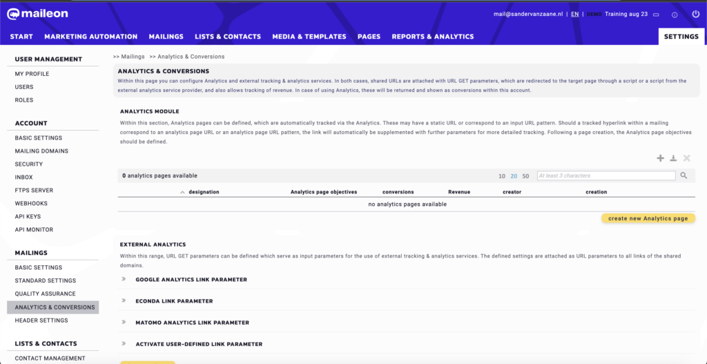 In Maileon kun je centraal je utm-parameters instellen. Zo worden deze automatisch op al je campagnes toegepast. Dit doe je door te gaan naar “Settings” > “Analytics & Conversions“. Hier klik je op “Google Analytics Link Parameter” en in de drop down vind je: